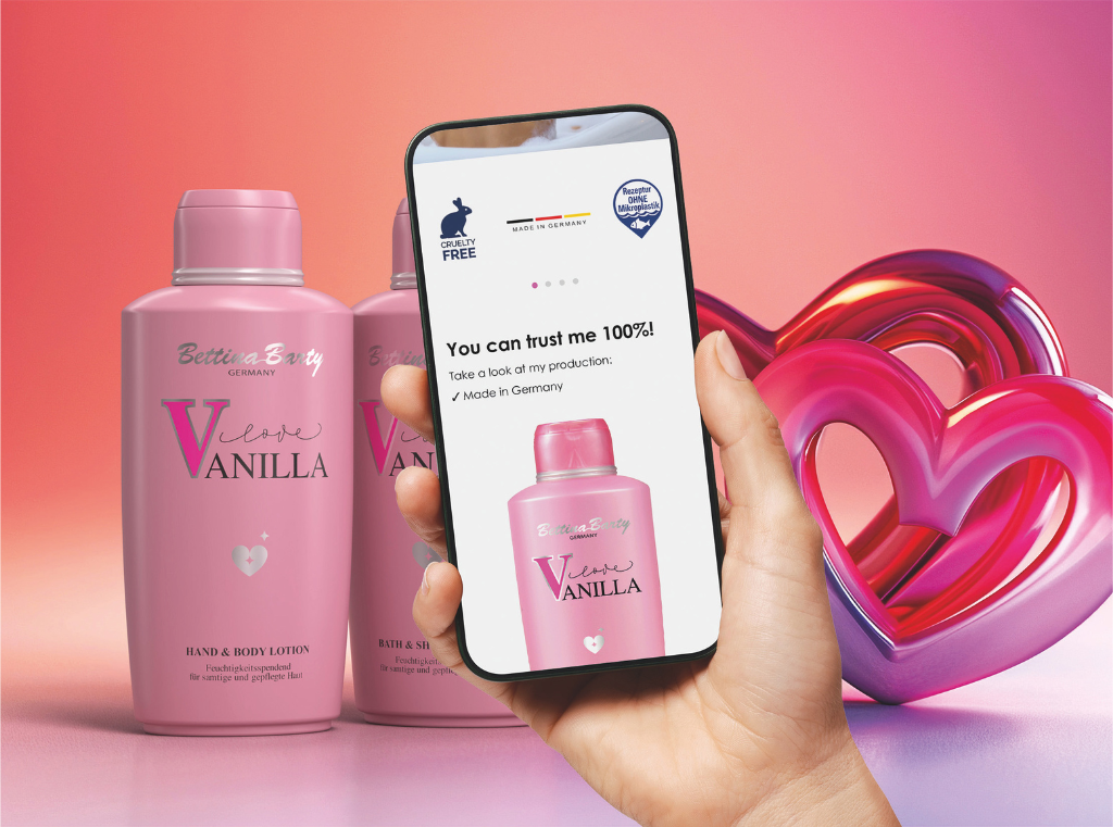 Der Produktpass ist prominent auf der Verpackung platziert; Interessentinnen müssen einfach nur ihr Smartphone an den DPP halten und Love Vanilla startet die Interaktion. Ab dem ersten Scan präsentiert sich das Produkt Love Vanilla als offene, sympathische und auskunftsfreudige Gesprächspartnerin, die die Nutzerin persönlich begrüßt und durch die Inhalte führt. Love Vanilla kommuniziert persönlich, emotional und liefert sehr transparent alle möglichen Informationen zu Anwendung und Inhaltsstoffen, Nachhaltigkeit, Herstellungsverfahren, Zertifizierungen, Kundenbewertungen und sogar zum Team, das hinter der Marke Bettina Barty steht. Exklusive Markenstorys und ein Countdown zu neuen Produktangeboten sorgen für Entertainment und Kaufanreize, ein Chatbot beantwortet individuelle Fragen und ein direkter Link zum Online-Shop ermöglicht eine reibungslose (Nach-)Bestellung. Bilder und Videos verstärken die emotionale Customer Experience und das Markenerlebnis.